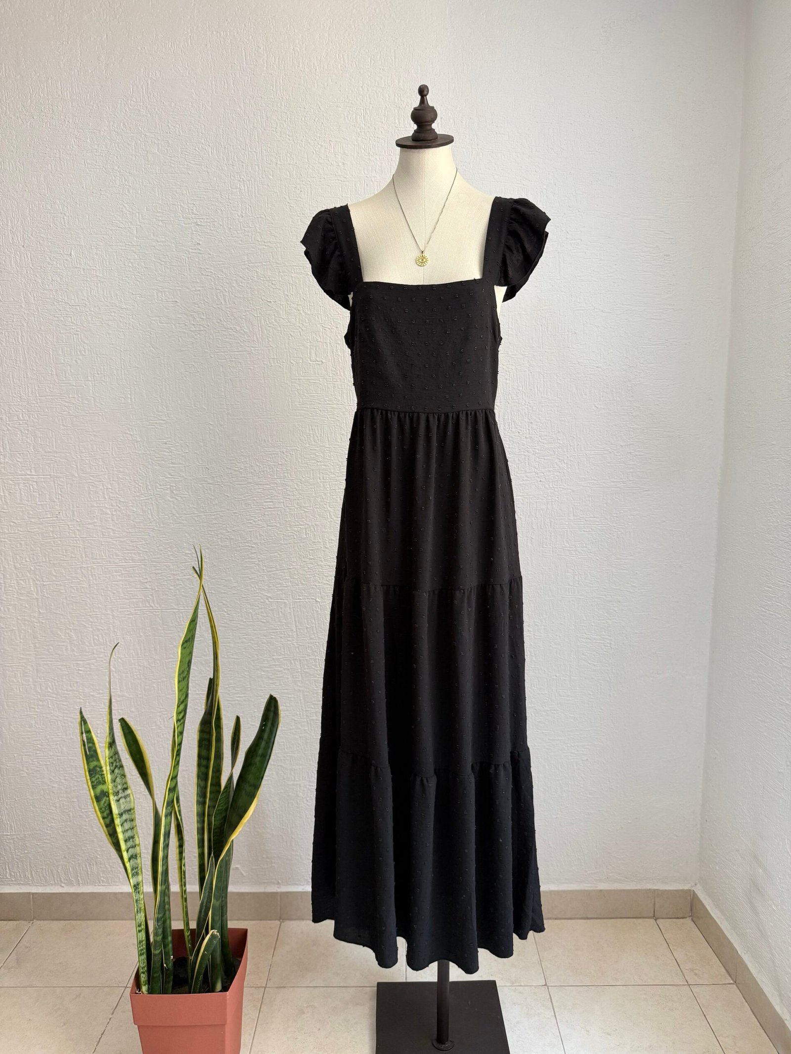 🍄Maxivestido negro con escote y elástico en espalda y textura plumetti