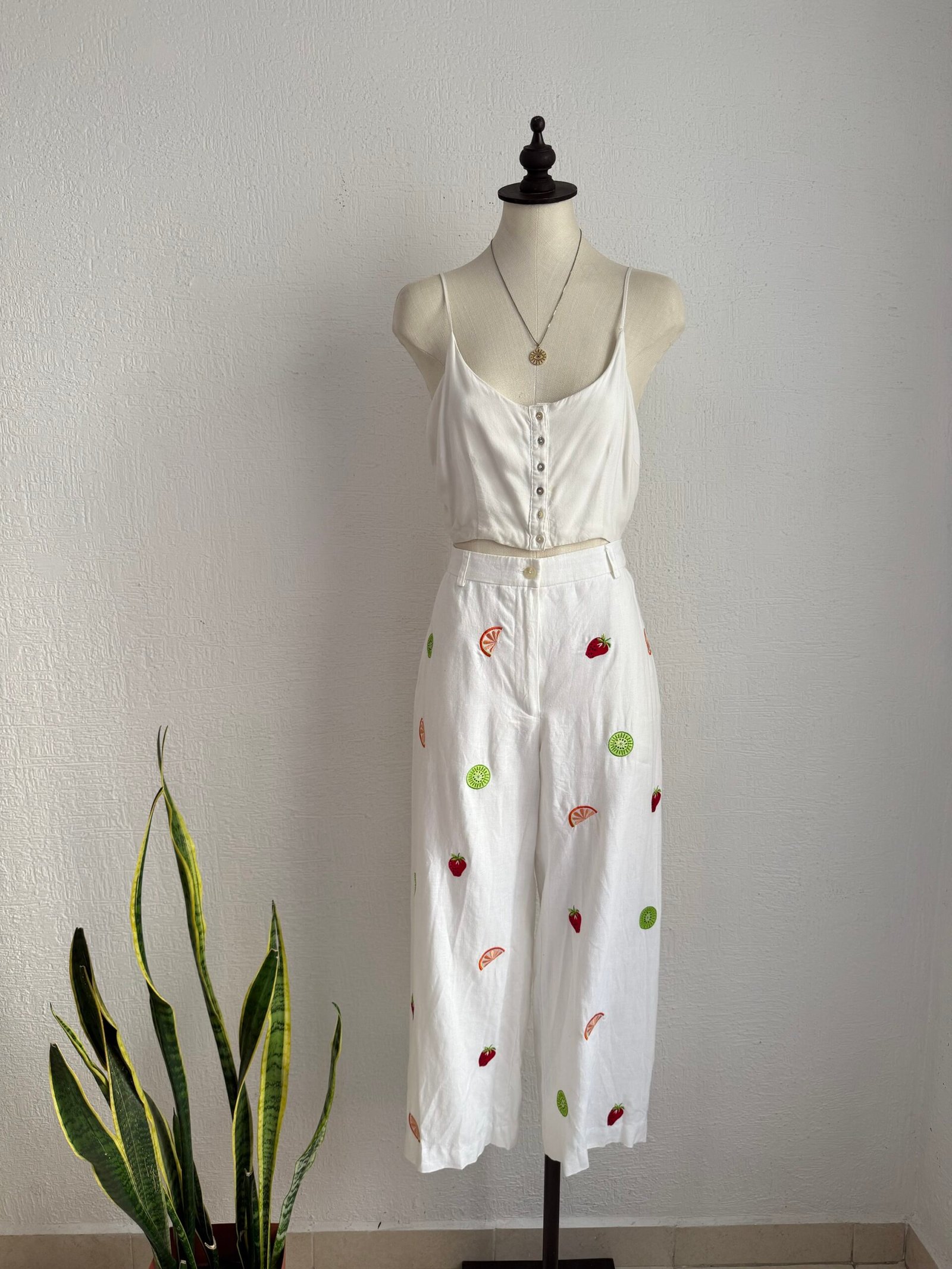 ☁️ pantalón blanco con frutas bordadas. En tiro alto. 100% lino
